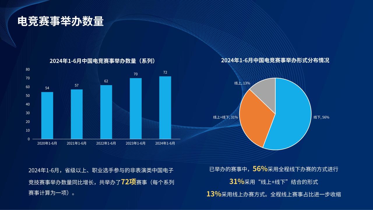 赛事数量方面,2024年上半年省级以上赛事数量有所增加,尤其是全程线下办赛的形式仍然受到欢迎。但线上赛事的比例也在上升,出现数字化转型的趋势。